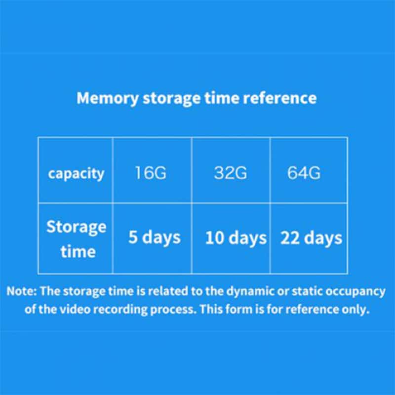 | Local storage | Support TF Card up to 128GB (TF card Not included), support 24 hours recording or alarm recording WIFI Supported Video control Supported Motion detection Supported |