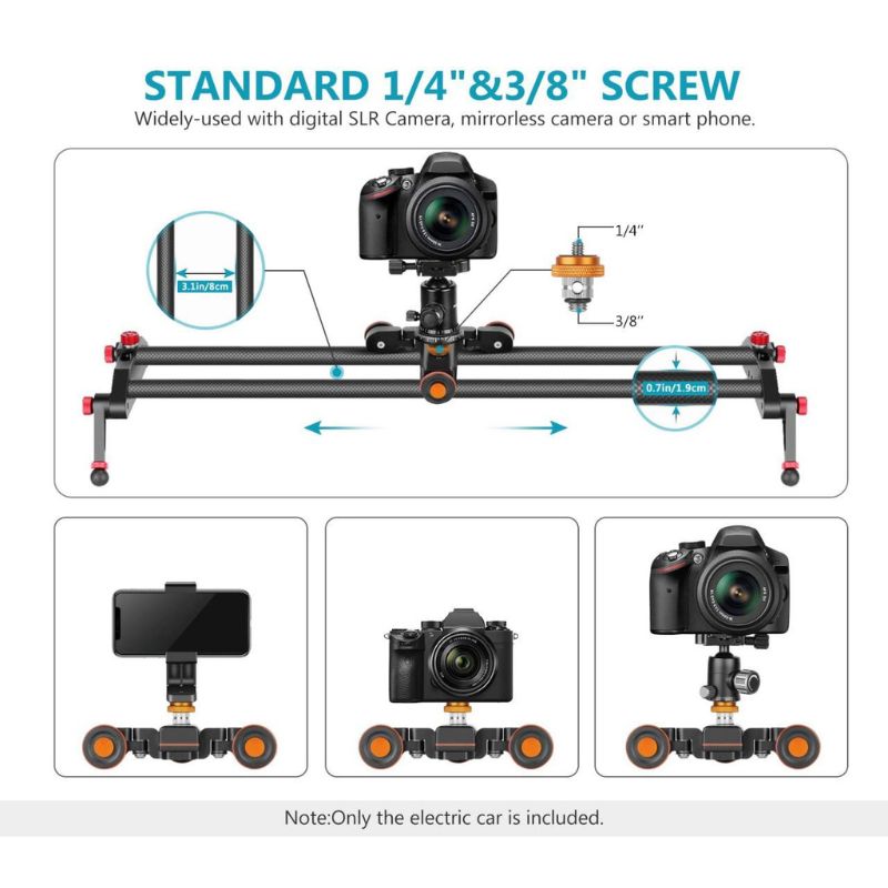 - Remote-Controlled Dolly: Neewer Motorized Camera Dolly is a perfect tool for shooting time-lapse, low-angle, and panoramic videos. Use the wireless remote control to set speed levels (1.4cm/s, 2.4cm/s, 3cm/s), change directions, and start/pause the dolly up to 19.7’ (6m) away. Note: there will be noisy during the operation of motorized dolly car when you are recording audio.